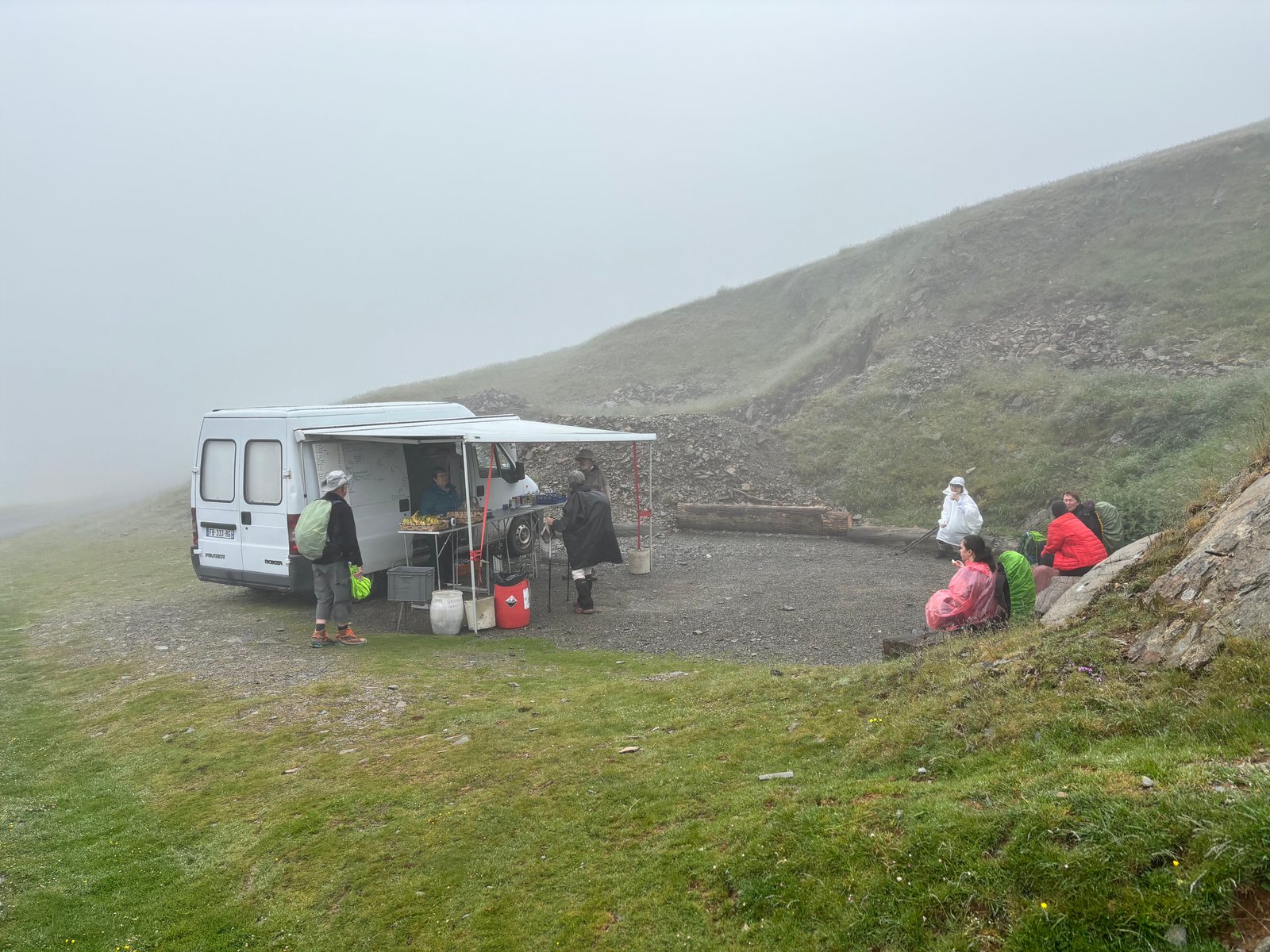 Partway up, we discovered a pilgrim’s oasis: a food truck minivan selling hot chocolate, espresso, coffee, bananas, and eggs. We each got a boiled egg, and the protein felt like instant energy. A sign near the van offered hope: 1 kilometer uphill left, then 5 kilometers flat, then 5 kilometers downhill.