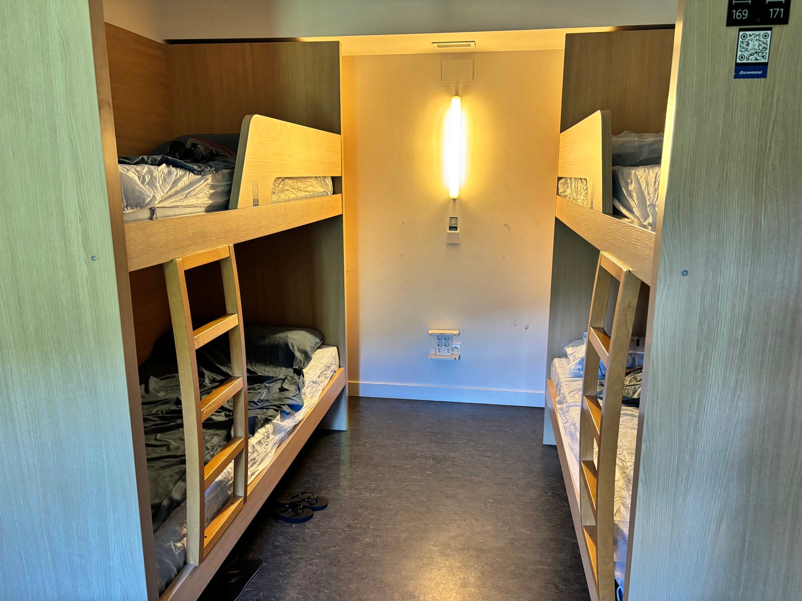 Upstairs, we found our assigned bunks—top and bottom beds with neighbors from Mont-Saint-Michel. This was a big albergue with 138 beds, but the beds were surprisingly comfortable.