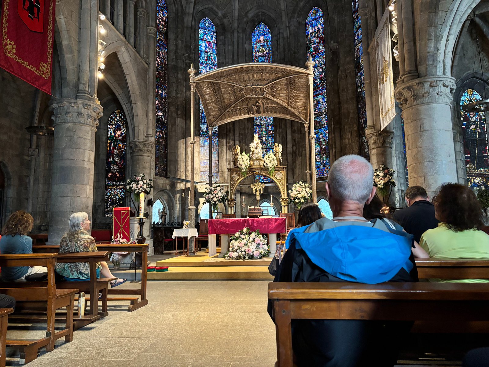 With time before the 6 PM service, we explored the monastery grounds. I spent €3.50 to see something truly remarkable: King Sancho VII’s grave and the Las Navas stained glass window.