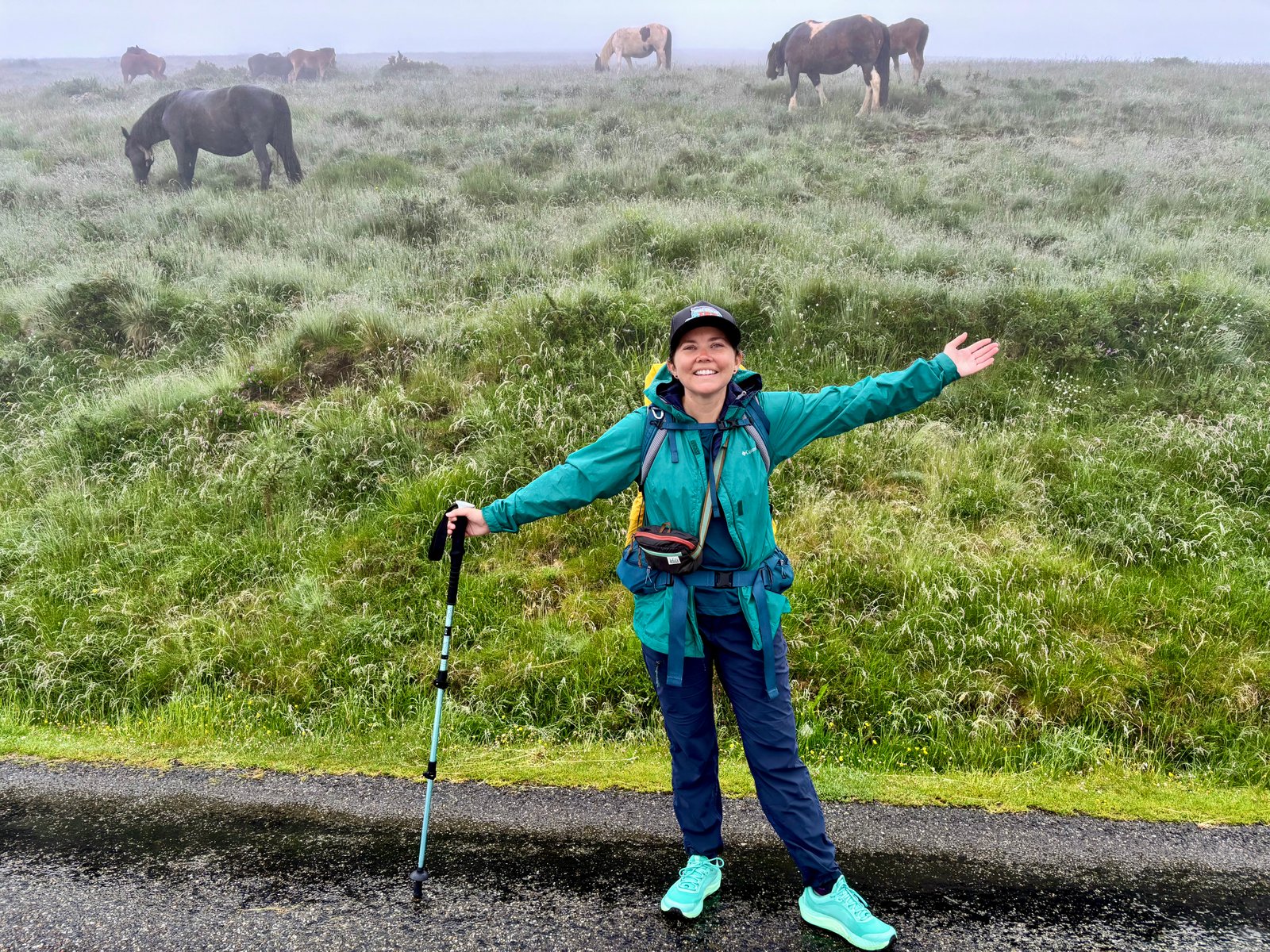 We pushed on, passing another field full of sheep and horses. The path led us through a tree-lined section that felt especially misty and magical.