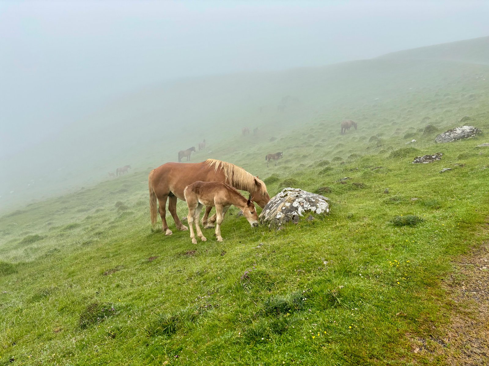 The landscape revealed itself in fragments through the fog. First, we came across spectacular horses—huge animals, some wearing bells that clanged softly as they grazed. An interesting encounter between man and a horse happened when a pilgrim doing the Camino on a bike came face-to-face with a horse unwilling to move from his path. A lot of yelling and bell ringing did nothing and ultimately the biker had to squeeze between horses and pray that they were in a good mood that morning. Luckily he passed through unscathed. We passed many sheep and saw evidence everywhere of how animals had shaped this farmland over centuries.