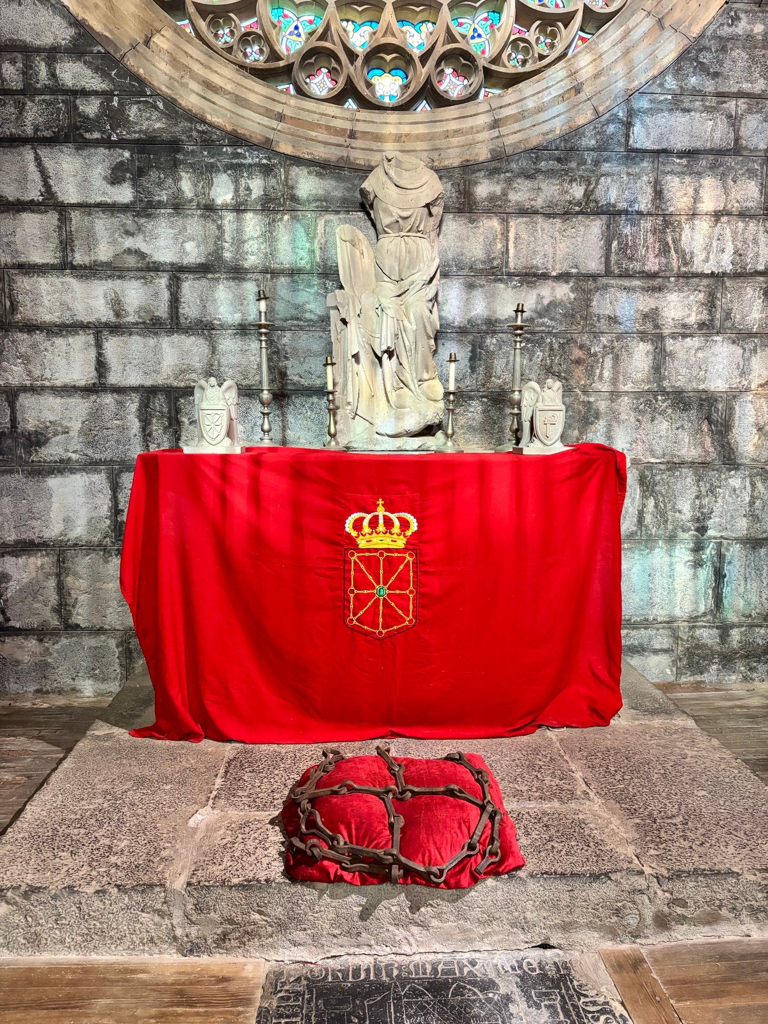 Behind the chapel gate, you can see one of the sections of chain from the Battle of Navas de Tolosa. The Almohad king’s guards, called the imesebelen, were tied to these chains. They became trophies of war and now form part of Navarra’s coat of arms.