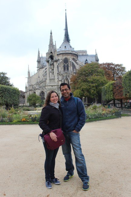 We had a very packed day ahead of us for our second day in this lovely city of Paris (including the Eiffel Tower, Notre Dame Cathedral, Saint-Chappelle, and Luxembourg Gardens), so we made sure to get up early and hit the road at 9a.m. The first stop was the very famous and awe-inspiring cathedral called Notre Dame. On a nice cool morning, we hit the road on our way and just before the cathedral, came across that oh-so-French oh-s0-delicious French bakery. The owner/baker/cashier barely spoke English but finger pointing always works and I ordered a pain au chocolat and Ashley (ordering in French) got a cinnamon raisin swirl. Man… I tell you… I have eaten some fresh baked pastries and breads back home but nothing compares to the French bakery. The pain au chocolat must have had hundreds of layers of flaky buttery chocolaty goodness and the nod and mmmm sounds from Ashley confirmed that her pastry was heavenly as well.